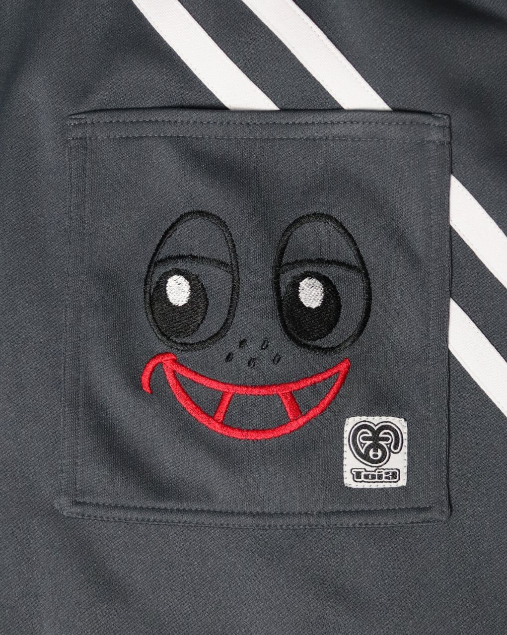 斜めに走る2本ライン、裾に星刺繍、そして後ろポケットのスマイルフェイス刺繍。